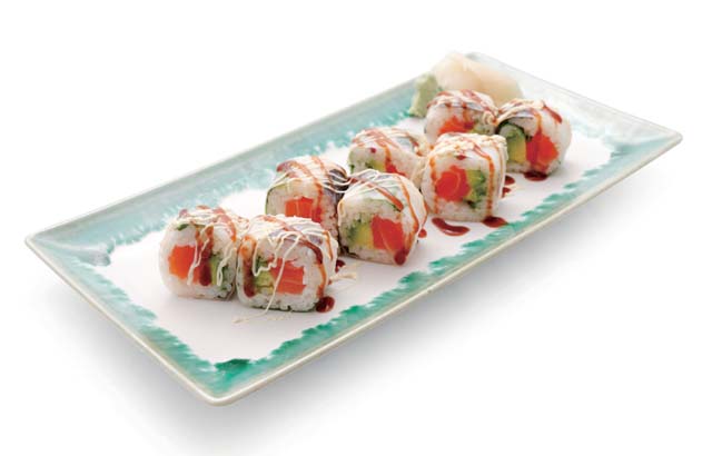 Saumon flambé, cheese, avocat, concombre, oeufs de lompe, sauce mayonnaise japonaise, sauce EEL