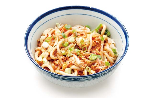 Soupe mise, Udon sautées, oeuf, ciboulette, choux, oignons frits avec poulet pané