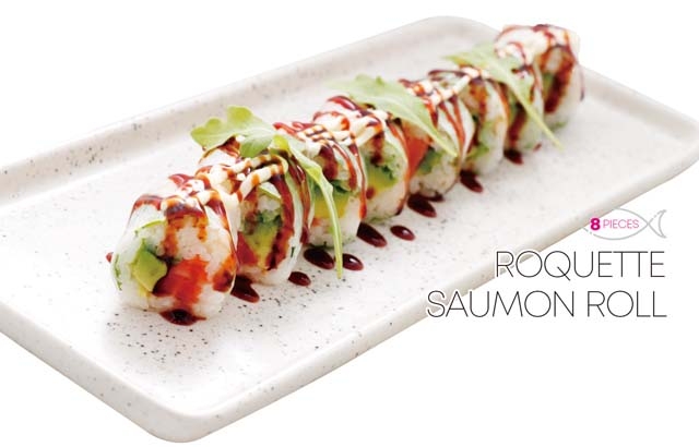 Saumon flambé, cheese, avocat, concombre, oeufs de lompe, sauce mayonnaise japonaise, sauce EEL