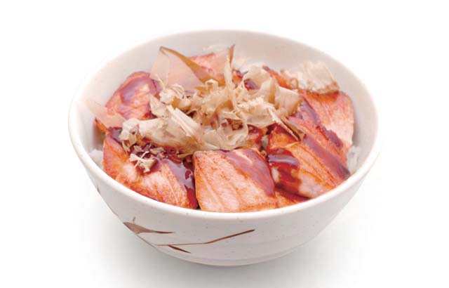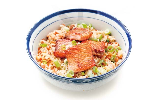 Riz sauté avec sauce teriyaki, saumon grillé avec sauce eel, mélange exquis, concombre, carotte